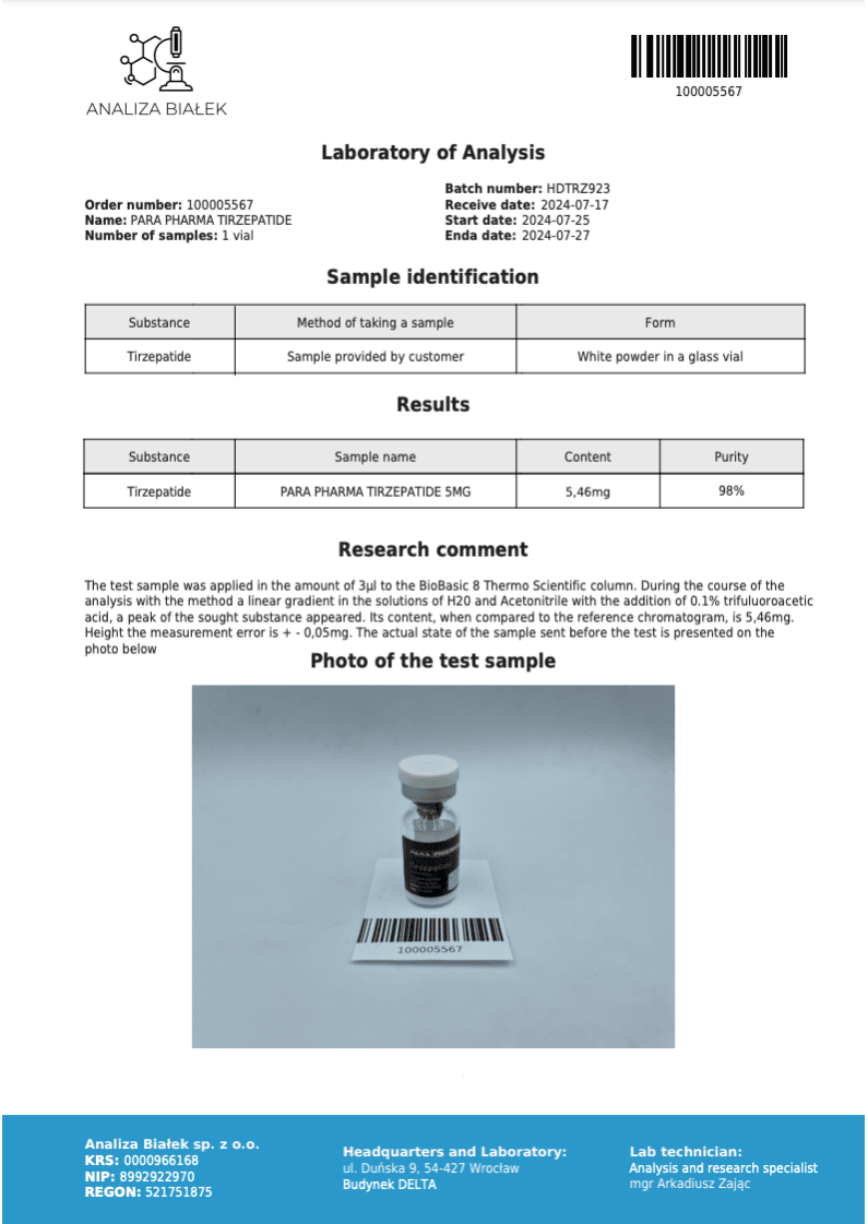 Para Pharma is known for consistent, high-quality manufacturing practices that meet pharmaceutical standards. Their Tirzepatide 5mg formulation is precisely dosed, sterile, and produced in GMP-compliant facilities. This ensures a stable, effective compound with maximum bioavailability and safety.